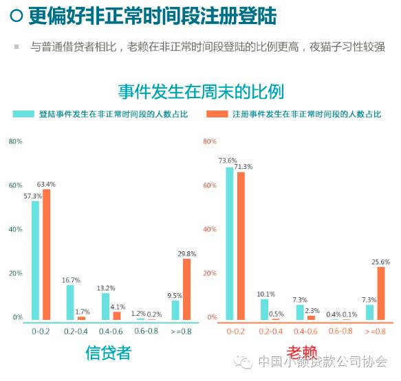 如果告诉你,大部分老赖在白天都比较正常,不正常的行为都集中在夜晚,你会怎么想?事实正是如此——大部分老赖偏好在工作日注册登陆,与普通借贷者无差异;但是,老赖在非正常时间段登陆的比例明显高于普通借贷者,夜猫子习性较强,其中63.2%的老赖喜欢在类似凌晨等非正常时间登陆;